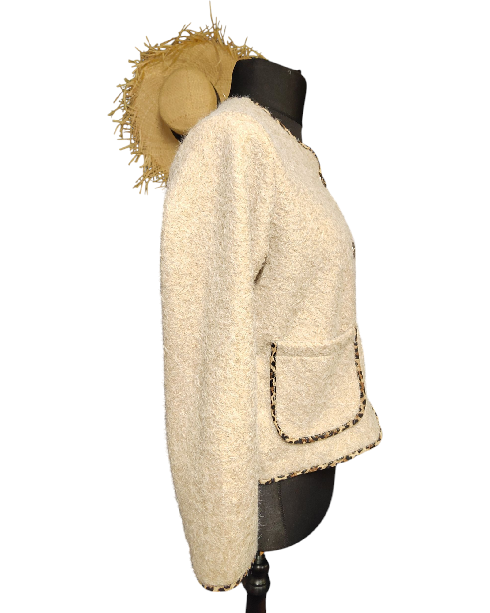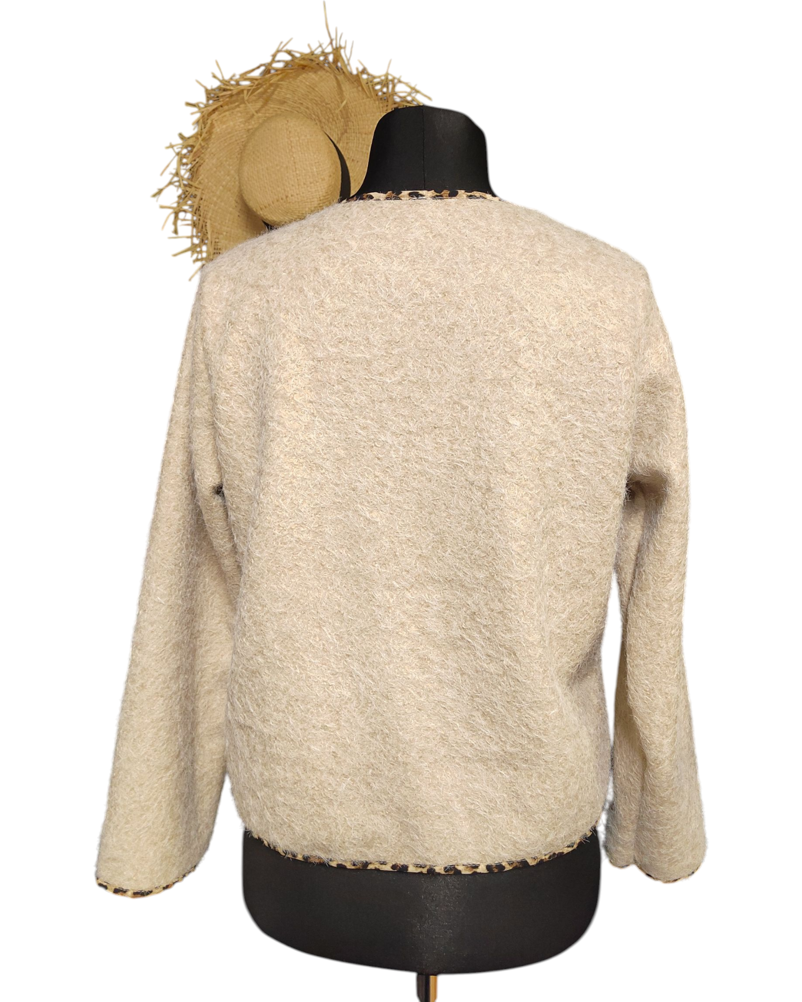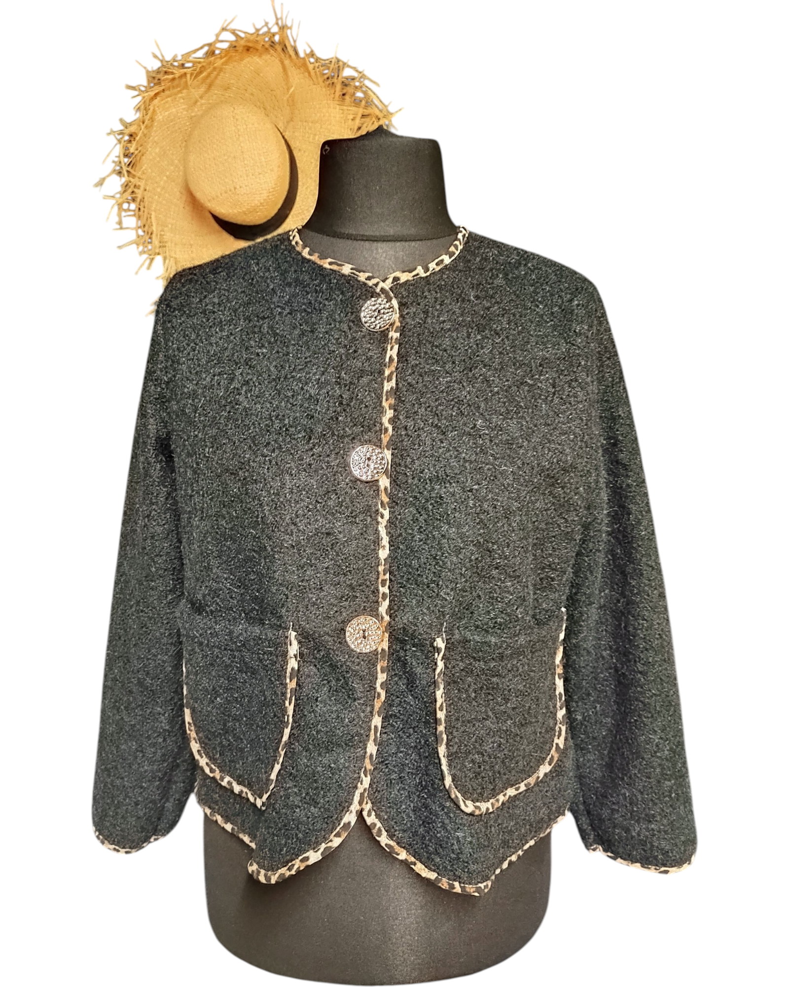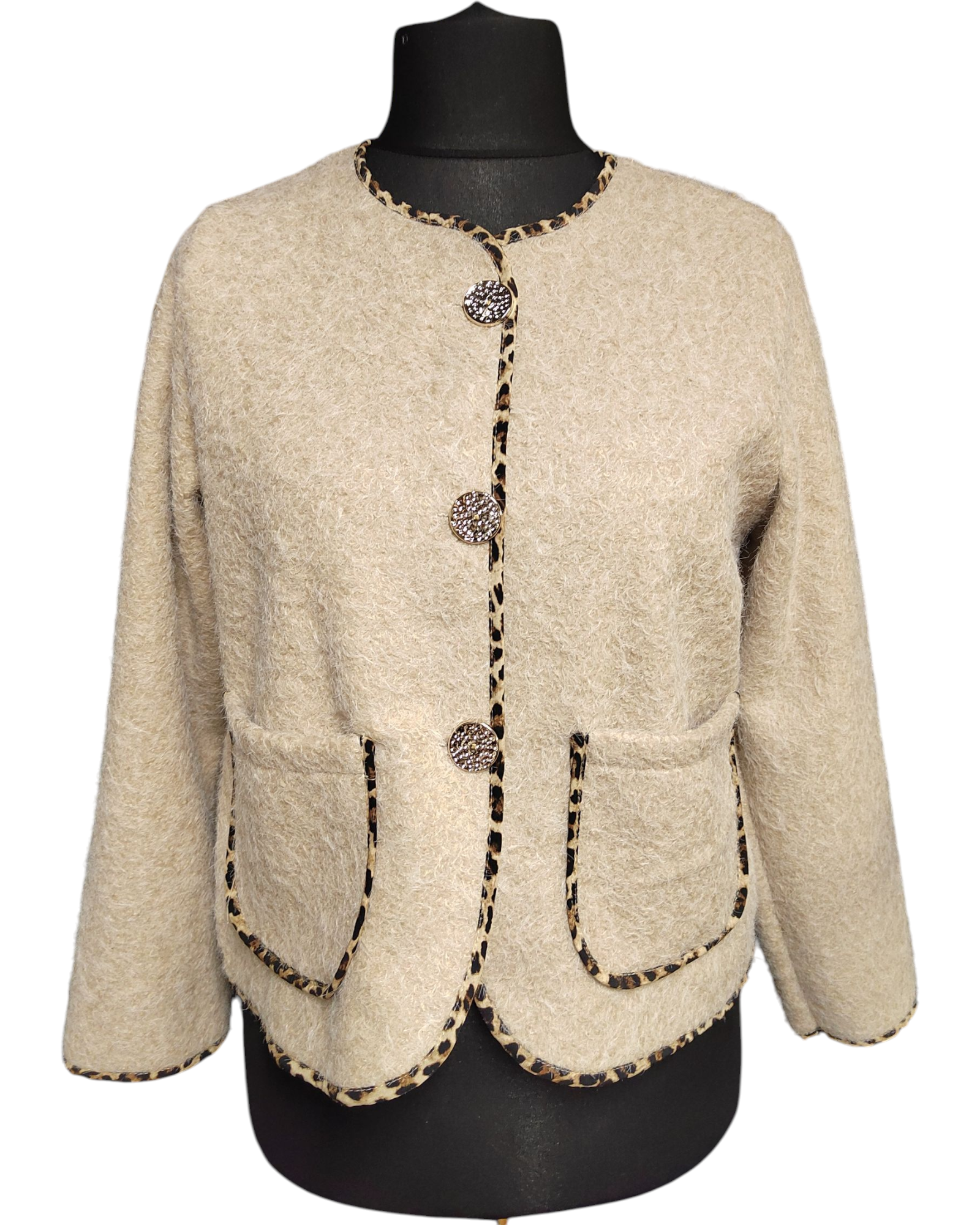 Découvrez notre veste CARLA, parfaite pour toutes les occasions ! Avec sa longueur de 54cm et son tour de poitrine s'étendant jusqu'à 110cm, elle offre un confort et une élégance incomparables. Son liseré léopard et ses 4 boutons ajoutent une touche tendance à cette veste en 100% polyester, fabriquée en Italie. Convient aux tailles 36 au 42.